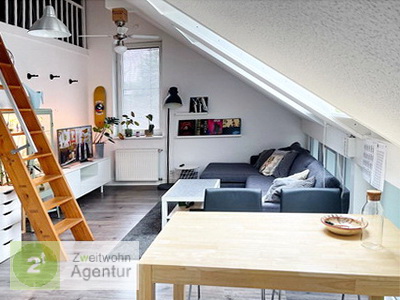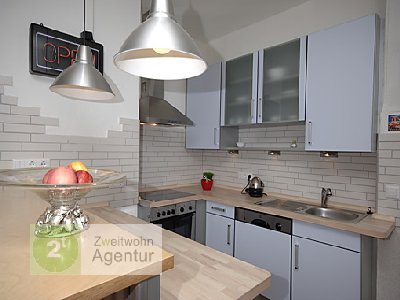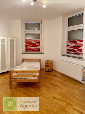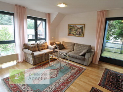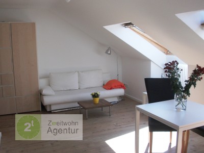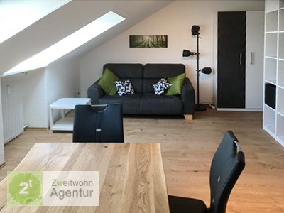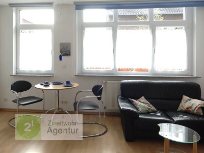 Moderne, hochwertig möblierte 2-Zimmer-Wohnung im 1. OG eines Mehrfamilienhauses. Wohnzimmern mit 2 Sofas, eins davon Schlafsofa 1,40 x 2,00m, Couchtisch, Sessel, SAT-TV, HiFi-Anlage und Schreibtisch...